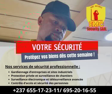 👉 Contactez EMC SECURITY dès aujourd’hui via WhatsApp pour une évaluation professionnelle et gratuite de vos besoins en sécurité à Yaoundé.